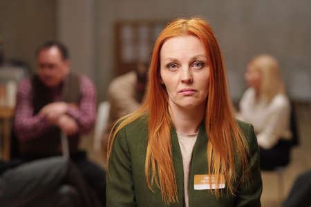 Serious middle aged woman in casualwear looking at you while sitting against patients and counselor