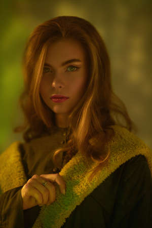 A thoughtful beautiful model girl in a stylish coat poses in yellow and green light in dark at the studio. Fashion collection. Haute couture clothing.