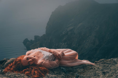 Beautiful young woman on a cliff of a mountain near the sea.