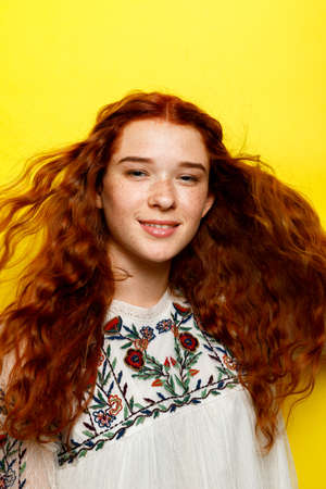 Indoor portrait of excited curly woman with trendy makeup. Ginger caucasian young lady smiling on yellow background.