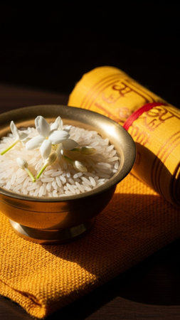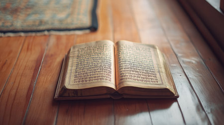 South Asian religious texts placed on a woven mat, intricate traditional decor surrounding, ample copy space