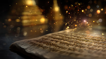This captivating image features an ancient manuscript, beautifully illuminated by soft golden particles and bokeh, showcasing its historical and cultural significance.