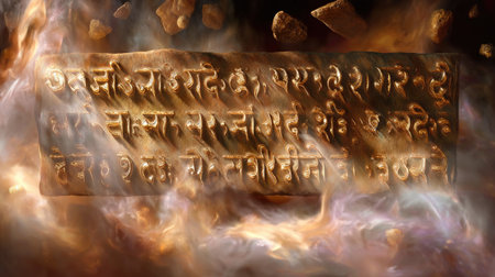 This captivating image features an ancient text engraving on a stone tablet, enveloped in mystical smoke and glowing light, evoking a sense of history and mystery.