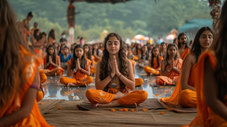 An outdoor meditation gathering shows young women in vibrant orange robes practicing yoga. They are seated, expressing peace and focus amidst a lush, natural setting.