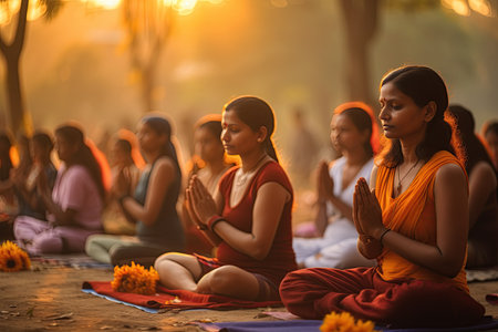 Yoga festival in India. Participants practicing yoga poses amidst natural surroundings.Generated with AI