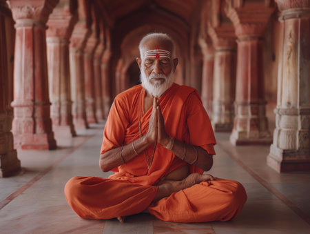 Elderly Indian sadhu in orange robes meditating peacefully in a temple corridor.