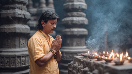 A solemn man is seen praying before an ancient shrine, enveloped in fragrant incense, with flickering lights around him, embodying deep spirituality and devotion.
