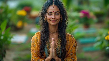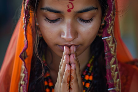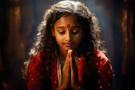 Hindu girl praying, peace, hope, dreams concept. Ai generated