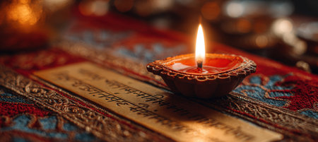 A close-up of a glowing Diya next to a gold-text plaque, featuring a rich color palette of reds and oranges. The image exudes a cozy, festive atmosphere in a fine art style.
