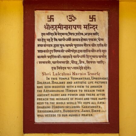 Bilingual explanation Sign of Shri Laxminarayan Temple, Birla Mandir, Hindu Vishnu Temple in New Delhi, India, Asia.