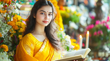Indian Woman Celebrating Basant Panchami in Traditional Attire Surrounded by Flowers and Candles. Concept of Cultural Festivals, Spirituality, and Heritage.