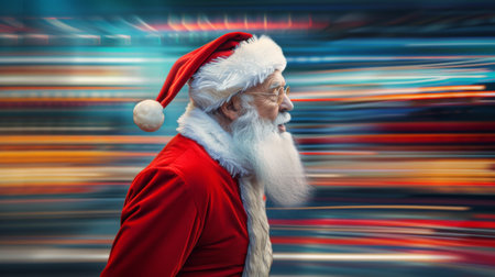 Candid street photography of a cheerful Santa Claus with festive Christmas ornaments, blurred bokeh effect, urban scenes