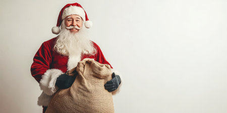Santa Claus cheerfully holding a large burlap sack of presents, set against a plain white background, evoking a festive and joyful holiday mood.