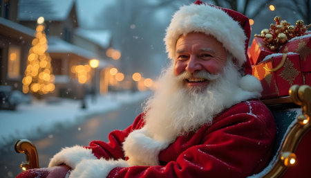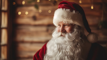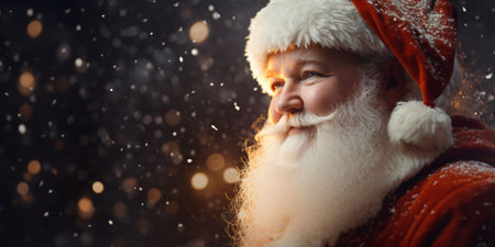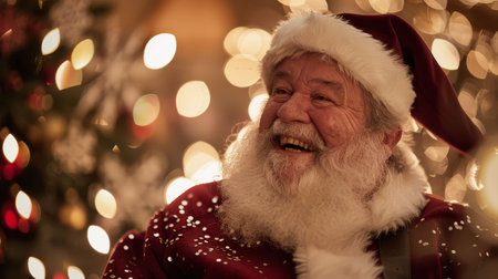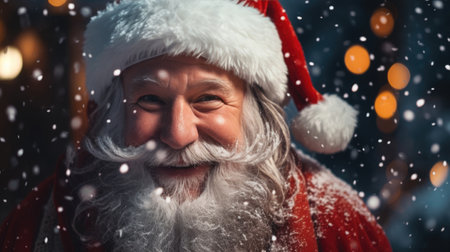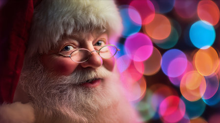 A captivating close-up portrait of Santa Claus features a warm smile and a fluffy beard, surrounded by beautiful holiday lights creating a magical festive atmosphere.