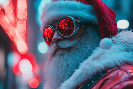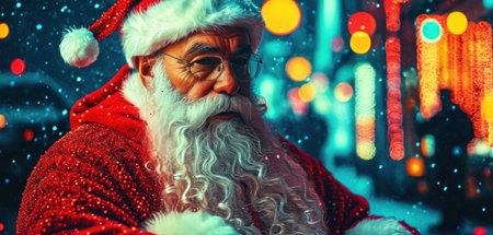 A close-up shot of Santa Claus, showcasing his intense expression and glasses, set against a backdrop of warm, blurred holiday lights, evoking nostalgia and joy.
