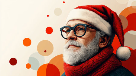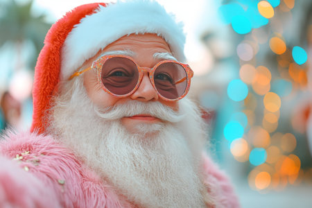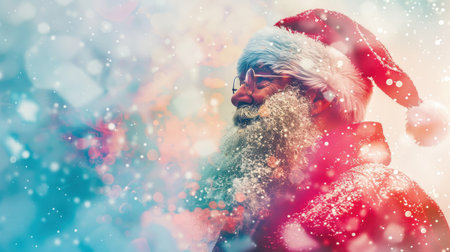 Cheerful Santa Claus wearing glasses and a red hat smiles warmly against a colorful bokeh background, embodying the spirit of the festive season.