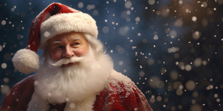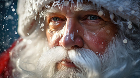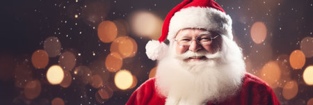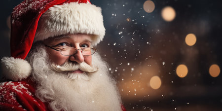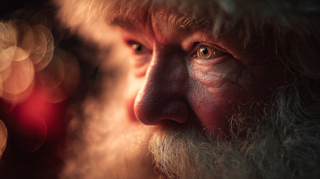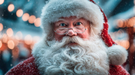 A captivating close-up of Santa Claus against a backdrop of twinkling Christmas lights, evoking the warmth and joy of the festive season.