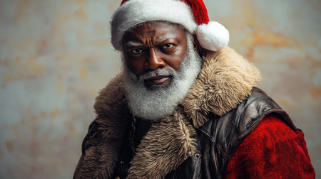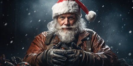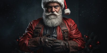 Portrait of a brutal Santa Claus in a leather jacket on a dark background.