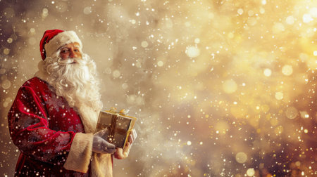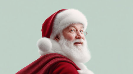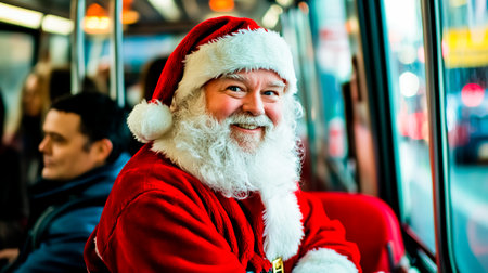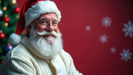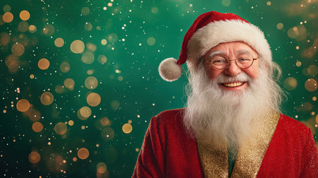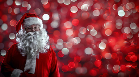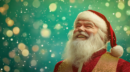 A cheerful Santa Claus, donned in his iconic red suit and fluffy white beard, radiates joy as he enjoys the holiday spirit. Soft lights twinkle in the background, enhancing the festive atmosphere.