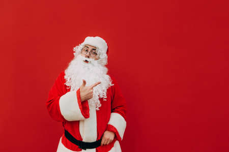 Surprised Santa Claus stands on a background of a red wall and points his finger to the side on the copy space, looking at the camera. Christmas and New Year concept.