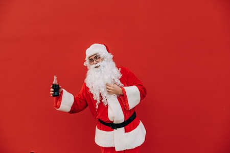 Bearded Santa Claus is standing in front of the red wall, smiling and offering soda coke drink. Santa is wearing a costume with belt.