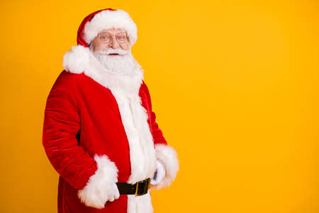 Ho-ho-ho. Bearded magic fairy miracle santa claus with big belly abdomen touch black belt wear style stylish trendy christmas newyear outfit isolated bright shine color background