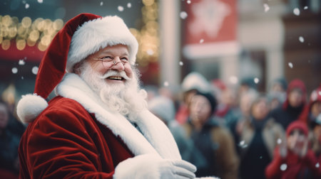 the essence of Christmas with Santa Claus in a festive setting, surrounded by a crowd of people, embodying the spirit of joy, celebration, and tradition.Background