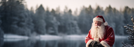 winter scene featuring Santa Claus traversing a snowy landscape near a frozen lake, surrounded by a tranquil forest.High resolution AI generated