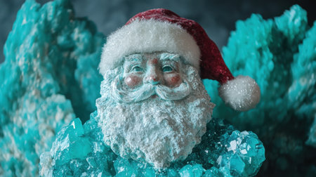 A charming Santa Claus figure adorned with a red hat is placed amid stunning turquoise crystals exuding a festive holiday spirit.