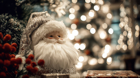 A festive Santa figure sits amidst twinkling lights and holiday decorations creating a cozy atmosphere for the New Year celebrations.