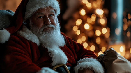 A man dressed as Santa Claus sits in a chair with a bag in front of him. The scene is set in a room with a Christmas tree and lights, creating a festive atmosphere