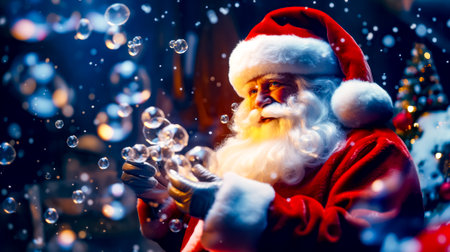 Man dressed as santa claus blowing bubbles on dark background with snow flakes. Generative AI.