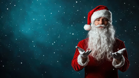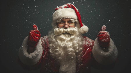 joyful figure in Santa hat and red suit stands against snowy backdrop, embodying festive spirit of Christmas. scene radiates warmth and cheer.