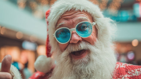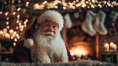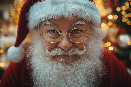 A charming portrait of a joyful Santa Claus with glasses, exuding warmth and kindness in a beautifully decorated Christmas setting filled with lights and cheer.