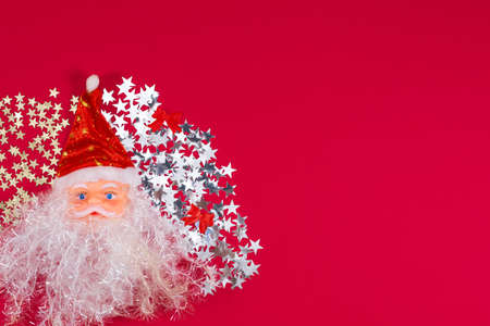 Christmas concept. Close-up portrait of a fairytale Santa Claus over red background. Good old traditions. Family holidays.