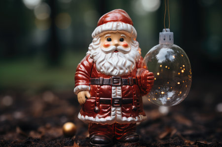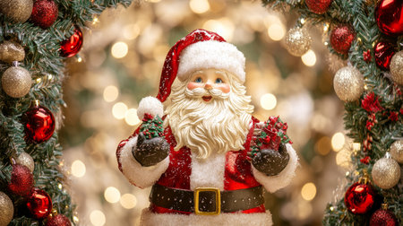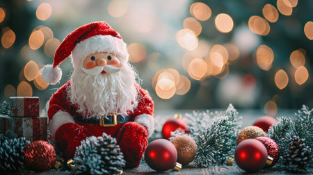 A cheerful Santa Claus figurine surrounded by Christmas ornaments, pinecones, and glowing holiday lights, set in a festive and warm scene.