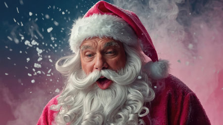 Elderly Man Dressed as Santa Claus Playfully Blowing Snow on Retro Pink Background.