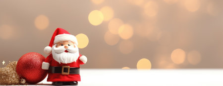 Santa Claus doll toy isolated on blue background. High quality banner. Bokeh light.