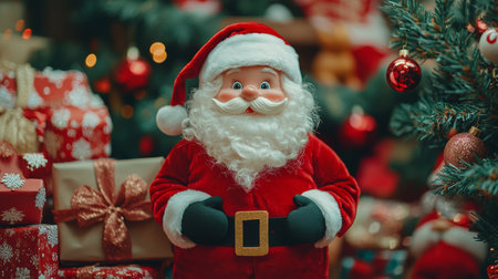 A cheerful Santa Claus figurine stands proudly before a beautifully decorated Christmas tree, embodying the festive spirit of the holiday season.