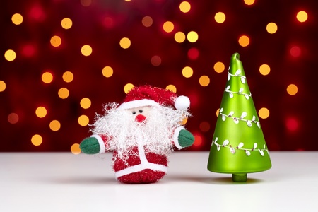 Portrait of toy santa claus with white beard in bright red suit and hat