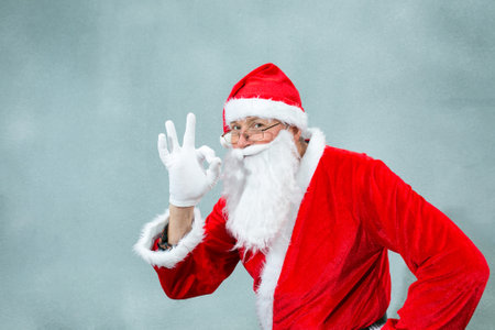 Portrait of Santa Claus on a gray background. Emotion concept. Santa Claus with hand gestures expresses joy at the coming of Christmas. Close-up on a gray background.