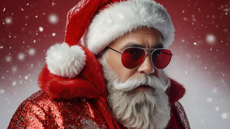 Portrait of a stylish, modern Santa Claus in a shiny jacket and red glasses in close-up on a pink background. Creative. It is snowing, adding fabulousness and magic.