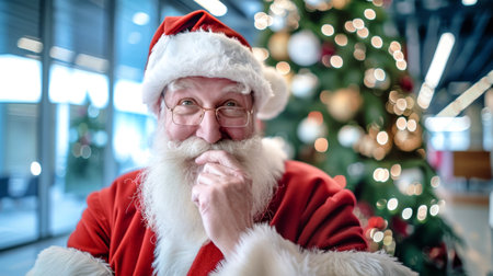 Santa Claus playfully gestures to shush the camera, surrounded by a festive Christmas tree in a bright, modern office atmosphere.