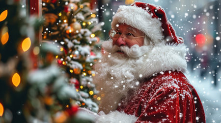 Festive Santa Claus gazes at onlookers surrounded by a magical winter market atmosphere.