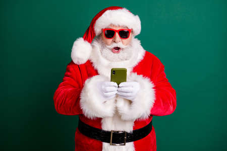 Photo of retired stylish grandpa white beard hold telephone open mouth shocked unexpected sale wear red santa x-mas costume coat gloves sunglass headwear isolated green color background