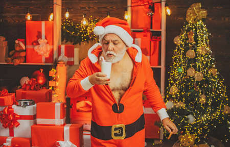 handsome bearded santa claus man with long beard on serious face holding glass of nonalcoholic cocktail in christmas or xmas sweater and new year hat on colorful studio background,copy space