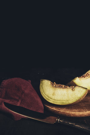 simple food ingredients concept, close-up of rockmelon on cutting board