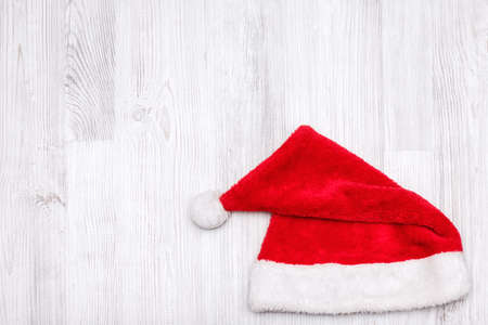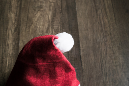 Santa red hat on wooden floor background, holiday Christmas abstract background.