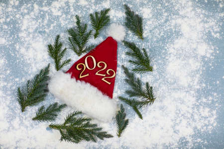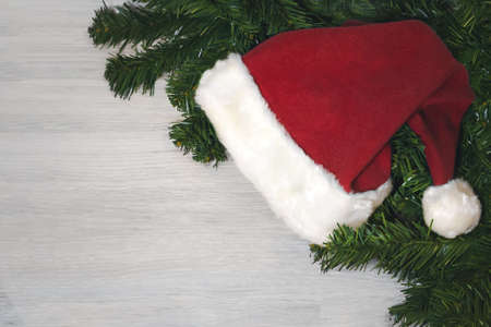 santa cap on a blue snow-covered background, around spruce branches, layout. High quality photo