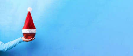christmas red ball in santa hat on hand over blue background, panoramic mock up image, merry christmas concept
